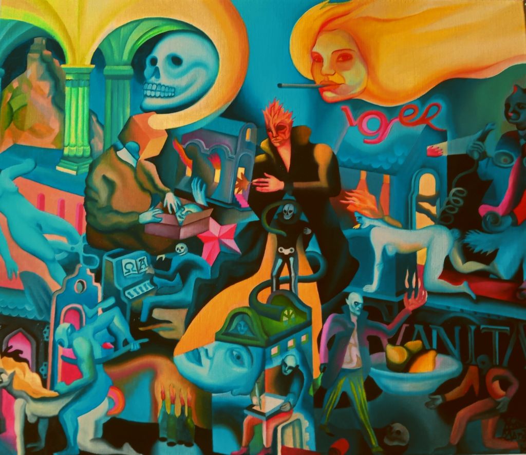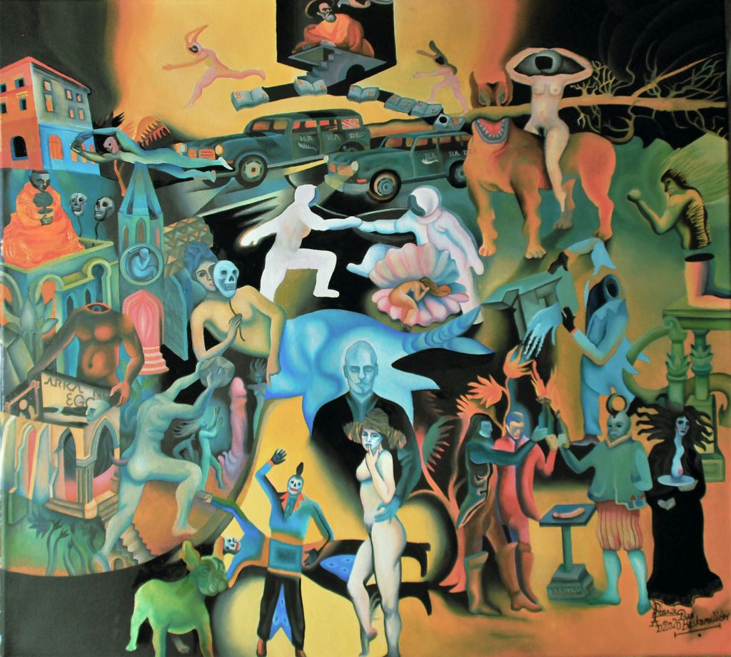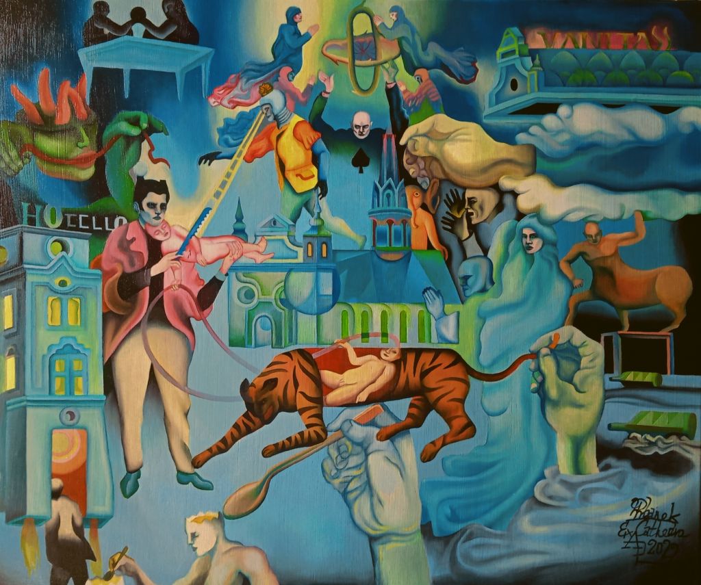 Autor poddaje analizie własne sny, które przetwarza w obrazy. Niektóre przedstawienia kojarzą się z literaturą lub powieścią graficzną, inne natomiast z motywami przeniesionymi z filmów. Tytuł obrazu wydaje się być przewodnikiem po świecie wizji artysty, który wypełnił swoje płótna wyimaginowanym pejzażem, gęstą strukturą figur i symboli ujętych w konwencji horror vacui. Przestrzeń jest umowna, wypełniona „akwatycznym” błękitem – sugerującym substancję snu – zaburzona jest nienaturalnej wielkości postaciami, przedmiotami czy dekoracyjnymi elementami architektury. Sceny przypominają te rodzajowo-alegoryczne czy religijno-wizyjne, które obecne były w malarstwie średniowiecza i renesansu – Hieronima Boscha i Pietera Bruegla, czy też w późniejszym malarstwie wybranych surrealistów. Równolegle dzieła wpisują się w nurty kojarzące się z estetyką zwaną magicznym realizmem – tłumaczy dr Katarzyna Sadrak.